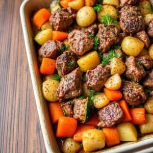 This diet-friendly meat and vegetable tray bake is a perfect choice for anyone following a healthy eating plan. This recipe is rich in protein, fiber, and vitamins. One serving (about 250 grams) is estimated to be around 220-300 calories, making it a complete and nutritious meal. Baking it in the oven reduces the need for oils and fats, making it very suitable for weight loss diets.